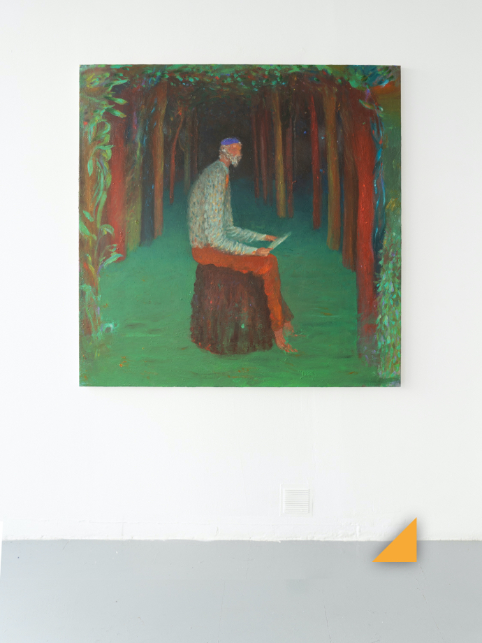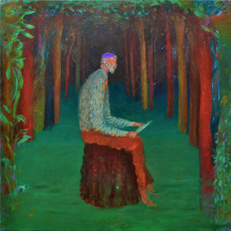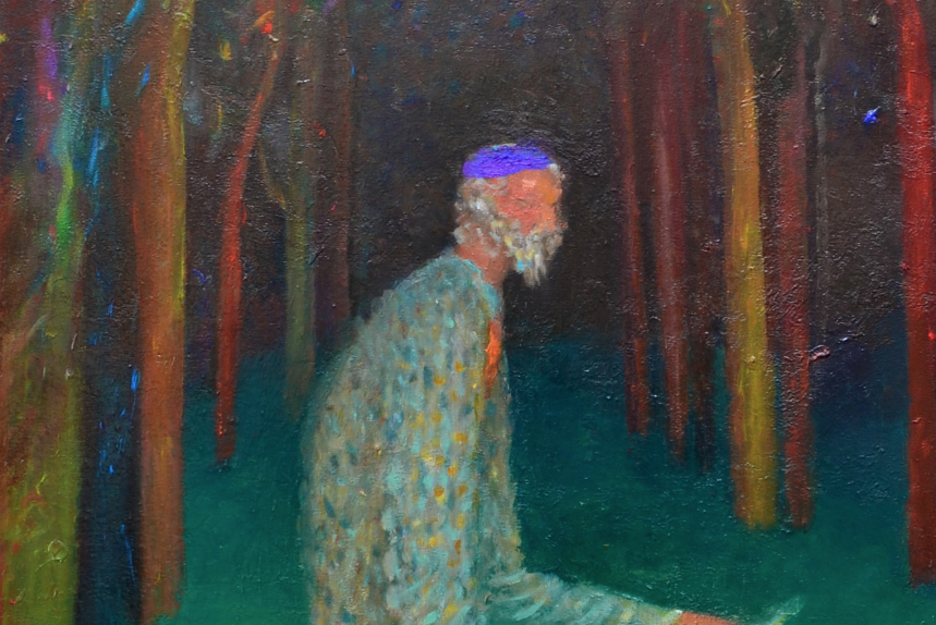 En Perdido silvestre imaginé un personaje similar a un explorador o un buscador de tesoros que habitara el mundo imaginado en Ventura. Una especie de ermitaño, un viejo solitario y exiliado al mas puro estilo Thoreau, que habita en lo salvaje. En este cuadro identifico o más bien relaciono de manera abierta la figura del explorador con el pintor.