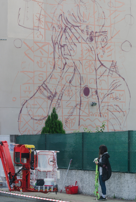 En ese momento estaba pasando por un momento de crisis creativa y de replanteamiento de muchas cosas, una de ellas era si seguía perteneciendo a «el grupo» de artistas urbanos, ya estaba obsoleta. Llevo pintando murales desde 2001, algunos me llaman mujer pionera ( no creo que lo sea, hay muchas antes que yo) y referente (cosa que agradezco, pero siento que aún tengo mucho que aprender como para que me llamen así) en este movimiento; y este parón por diferentes circunstancias ( haciendo algunos murales puntuales) me hacía replantearme muchas cosas. Me enfrentaba a esto, a salir fuera y volver a la vida de festival, cosa que prácticamente tenía olvidada y he de decir que la pandemia me había creado un poco de paranoia social, soy de ese grupo. Me enfrentaba a un formato vertical grande y a una serie de cosas que aún no me había enfrentado.