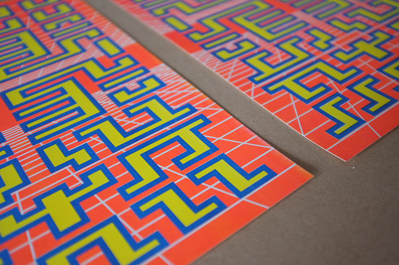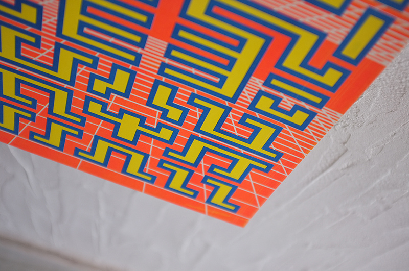 Con Atlas estamos trabajando un formato muy concreto para estas piezas, como si se tratase de un mapa de coordenadas. Son obras de 50 x 70 cm. sobre madera, que hemos pintado con spray acrílico. En ellas primero diseñamos las estructuras y su geometría. Trabajamos sobre el papel y en el ordenador, con el fin de ajustar todas las medidas. Cada pieza lleva como mínimo 4 capas de color superpuestas. Para ello utilizamos cinta de enmascarar y vinilo, creando el negativo de lo que queremos trasladar a la superficie. Es un proceso muy interesante ya que hasta que no se retiran todas las capas de vinilo no aparece la obra. Se trata de piezas únicas que se terminan con una capa doble de barniz de alta resistencia.