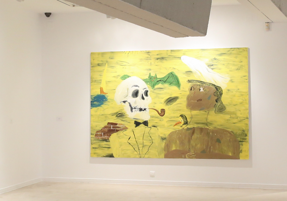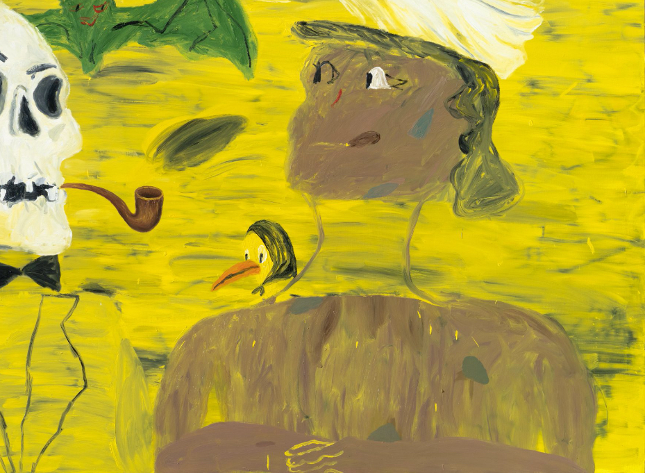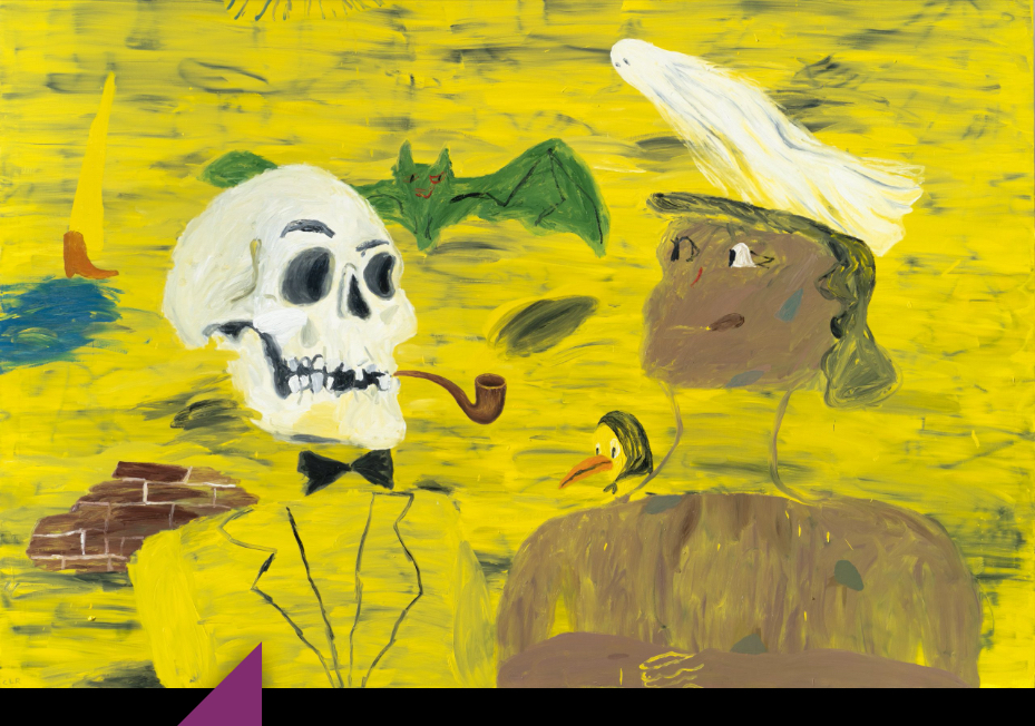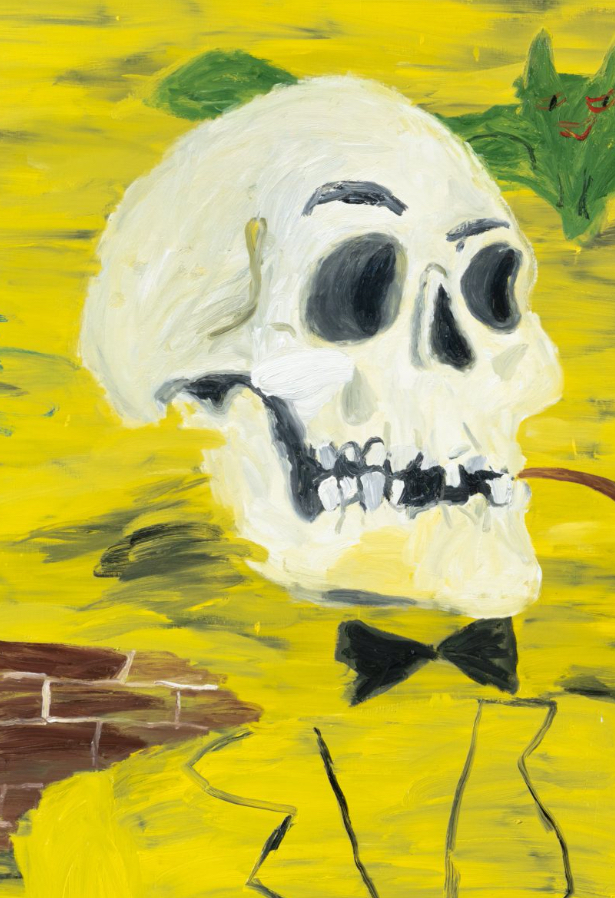 Entretanto, está protagonizada por un esqueleto con pipa y la figura de una mujer vestida de gala sobre un fondo amarillo donde sobrevuelan fantasmas y murciélagos, además de un pájaro con pañuelo sobre la cabeza que parece mirar con incredulidad al espectador.