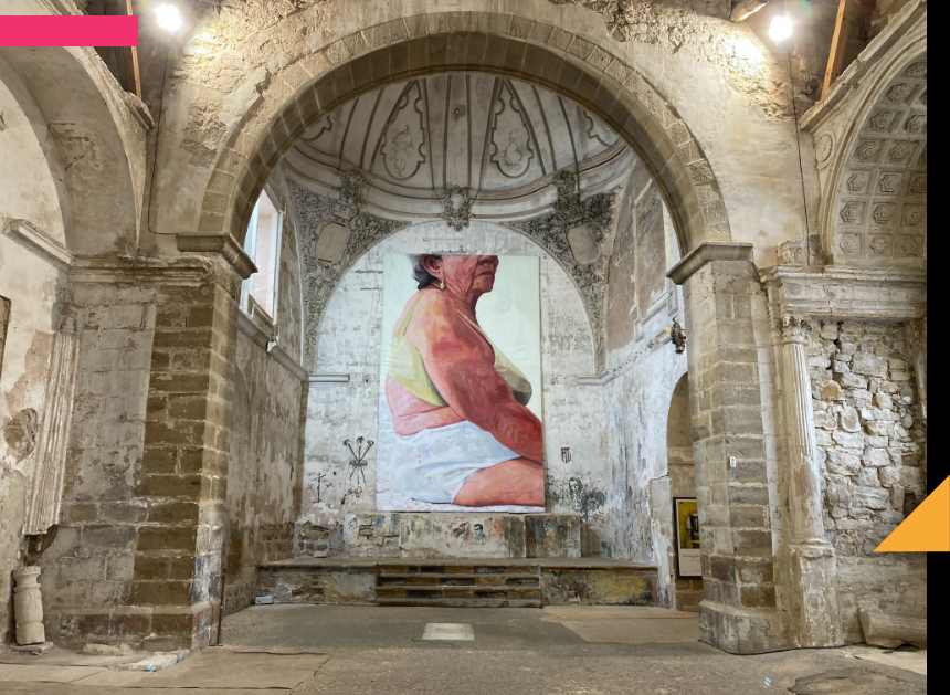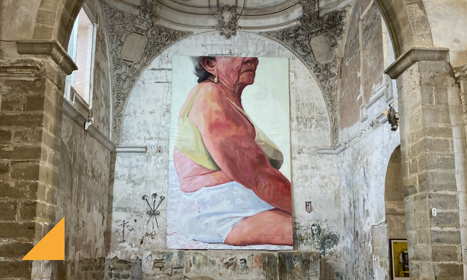 Una vez colocada la pieza, junto al resto de la exposición, pudimos comprender aún mejor (he de reconocer que emocionada) como la memoria del propio edificio junto a la de las mujeres mayores y su piel, la piel arquitectónica y la piel de la vejez bajo el amparo de una iglesia desacralizada que ha tenido usos múltiples, que se ha reciclado, reconvertido, seguían permaneciendo juntas, pintura y arquitectura.