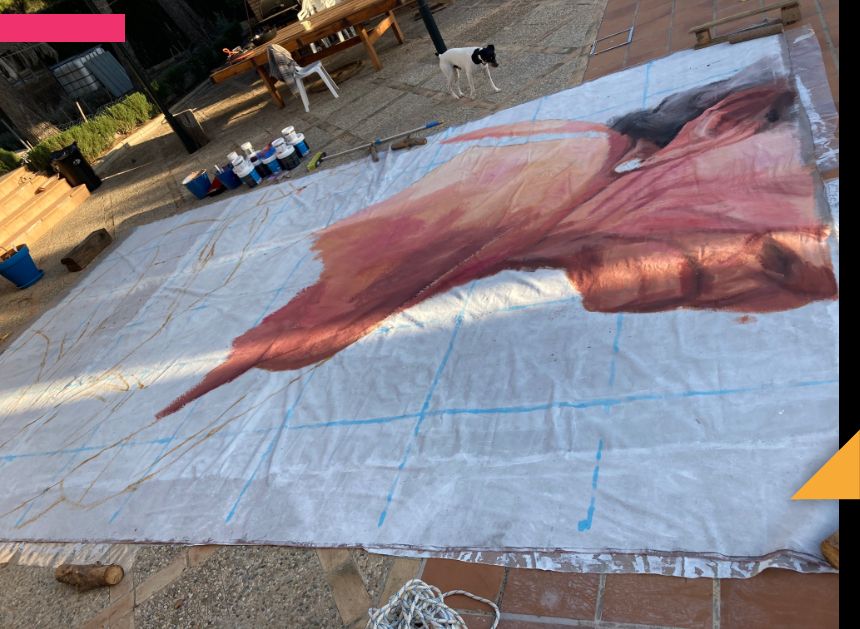 La ejecución de la pieza, por cuestiones logísticas, la hice entre mi estudio y una nave industrial en Écija gracias a mi hermano y mis tíos. En mi estudio la trabajé en el suelo, caminando y pintando sobre ella sobre todo la parte superior, mientras que para la parte inferior y para poderla ver en vertical, la colgamos del eje central de la nave. No la vi montada en el bastidor hasta que llegó a la iglesia. La adrenalina nos acompañó en todo momento.