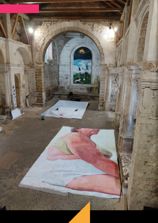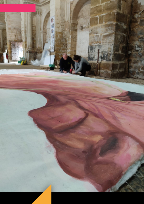 Un momento muy especial y emotivo fue el previo a montar, pues se encontraban en la iglesia tres piezas de tres exposiciones: Juan Vida, Santiago Ydañez y la mía. Las tres inundaron la pared y el suelo. Y también el momento de levantar el lienzo ya montado en el bastidor. Un total de 6,80 x 4,30 m que se levantaron a pulso entre 9 personas mientras la madera crujía y a Manuel y a mí se nos entrecortaba la respiración.